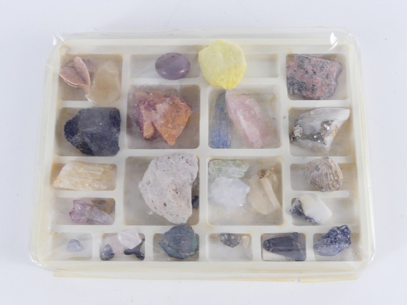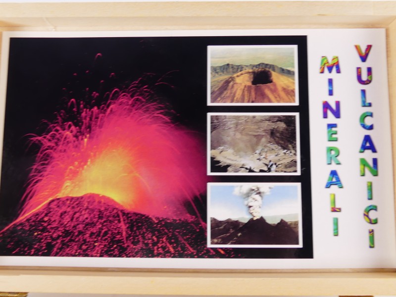 Afm. dozen tussen: 18,5cm x 23,5cm x 4cm en 24,5cm x 23,5cm x 4cm. - Houten doosje met 20 soorten vulkanisch gesteente; zoals zwavel, azuriet, malachiet en een staaltje met zwavel en een ander gesteente.