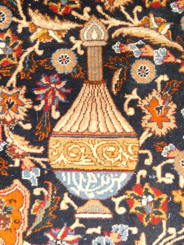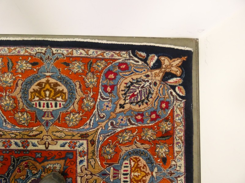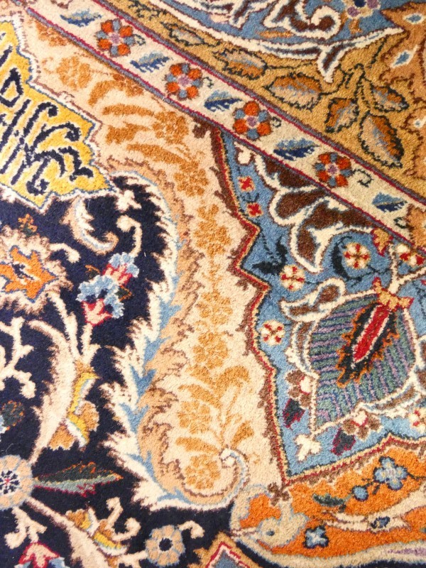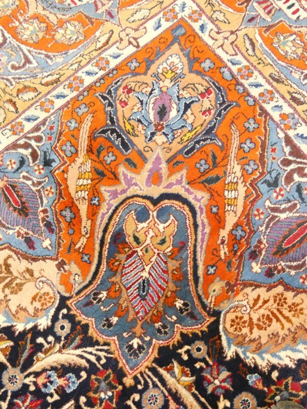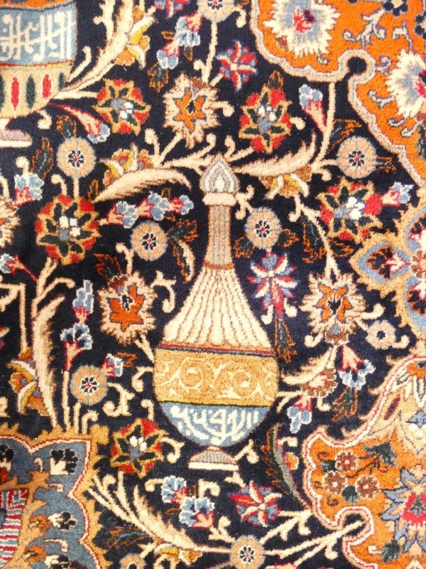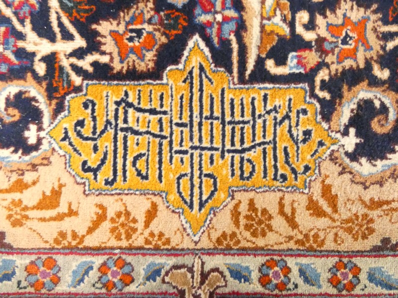 en opvallend tapijt met Perzische kalligrafiemotieven.