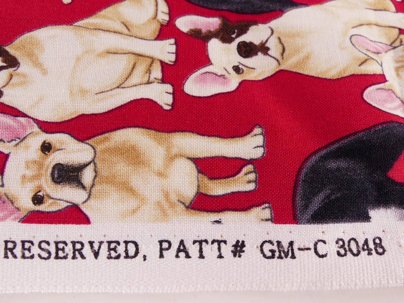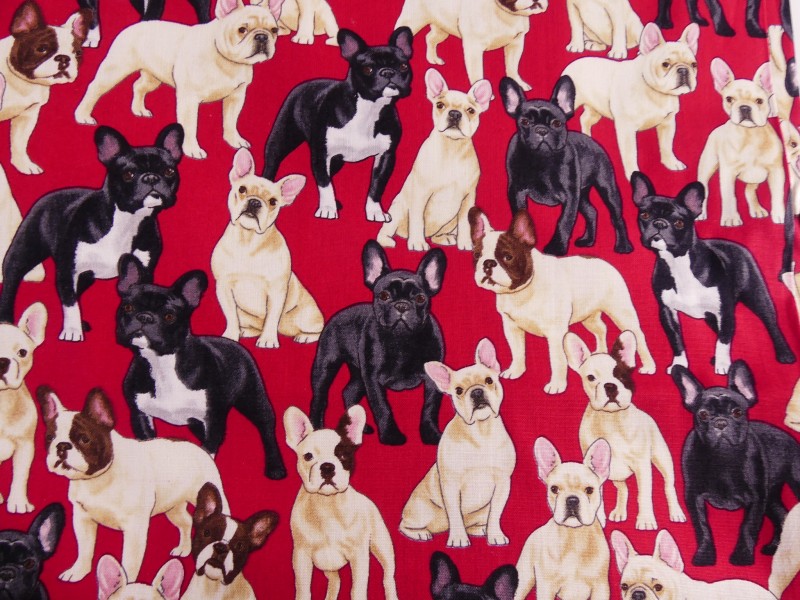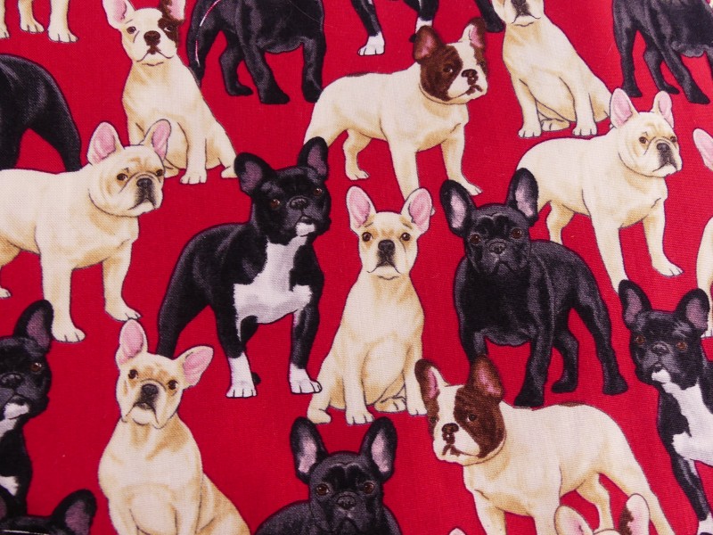 Een stuk rode katoenen stof met een patroon van Franse Bulldogs.