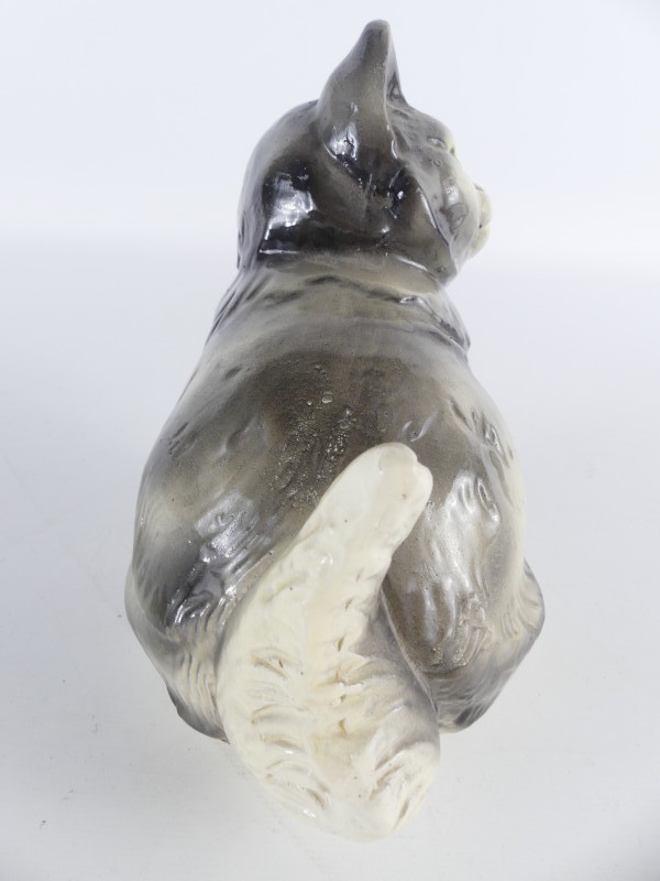 Realistisch vormgegeven porseleinen kat met levendige geelgroene ogen en een subtiel beschilderde grijs-witte vacht. Fraai handwerk met karakteristieke glans en licht craquelé in het glazuur.