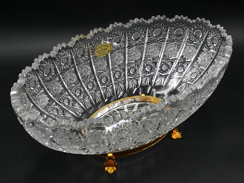 Handgemaakte Boheemse kristallen schaal – met goudkleurige metalen standaard (14×18×34 cm).