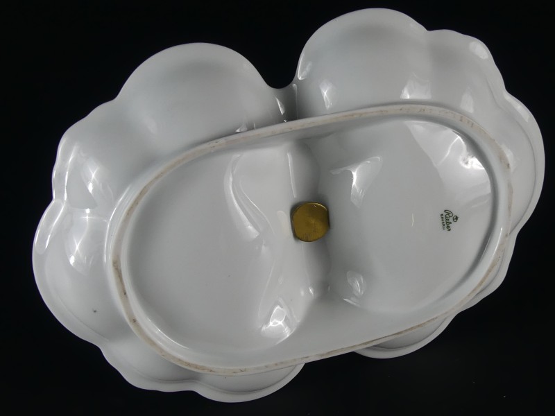 Elegant porseleinen duo: een fijn gedecoreerde Limoges France vaas met goudaccenten en sculpturale handgrepen, gecombineerd met een Retier Bavaria serveerschaal met metalen handvat. Beide stukken zijn handgedecoreerd met goud en florale details. Mooie staat met lichte ouderdomssporen. Een stijlvol setje voor het interieur of voor een verzameling.