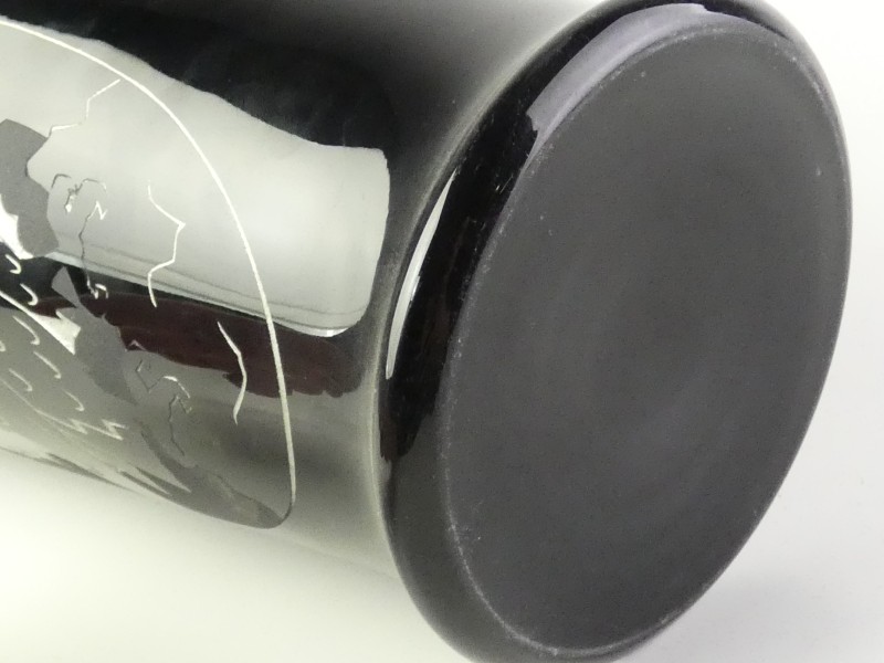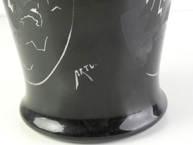 Stijlvolle schouwvaas met mat-geëtst vogelmotief (Artver – Booms Glas), gesigneerd Artver. Dit decoratieve stuk valt op door het mooie contrast tussen glanzend zwart en mat wit. De vaas verkeert in goede staat, met enkel lichte gebruikssporen aan de binnenzijde. Een prachtige blikvanger voor zowel interieur als verzameling.