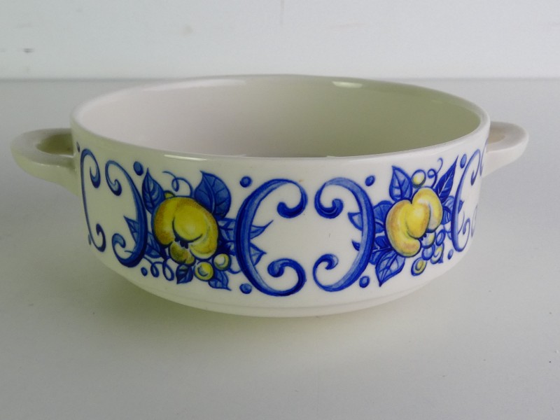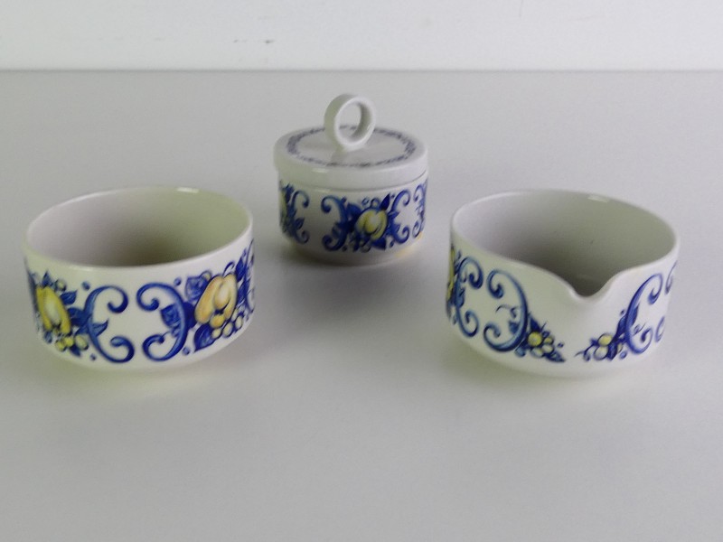 De serie werd vervaardigd in de periode ca. 1965-1985 en is geïnspireerd op Spaanse majolica: een witte basis met een levendig decor van blauwe krullen en gele medaillions.