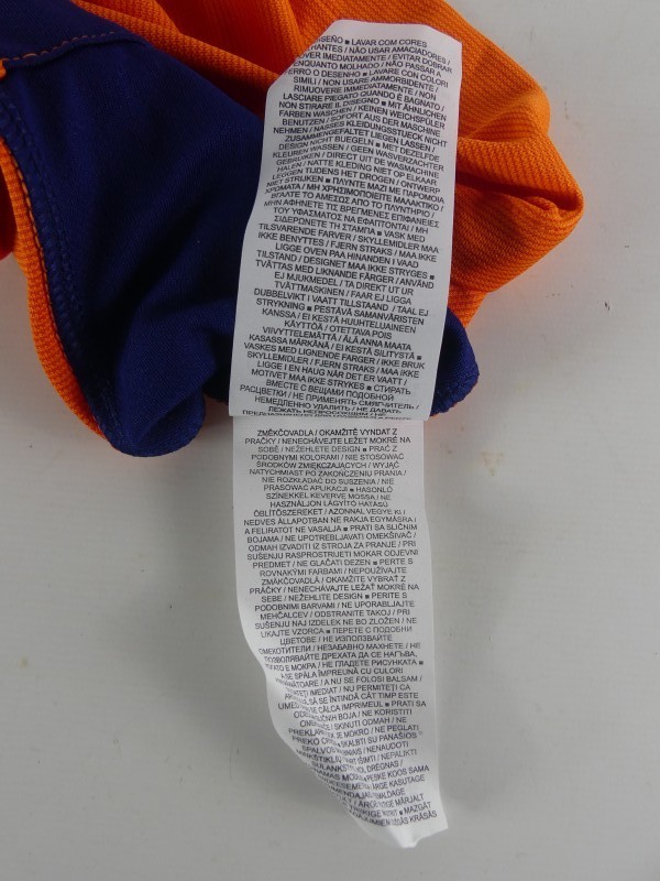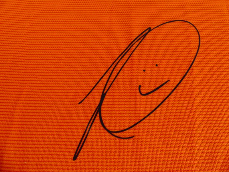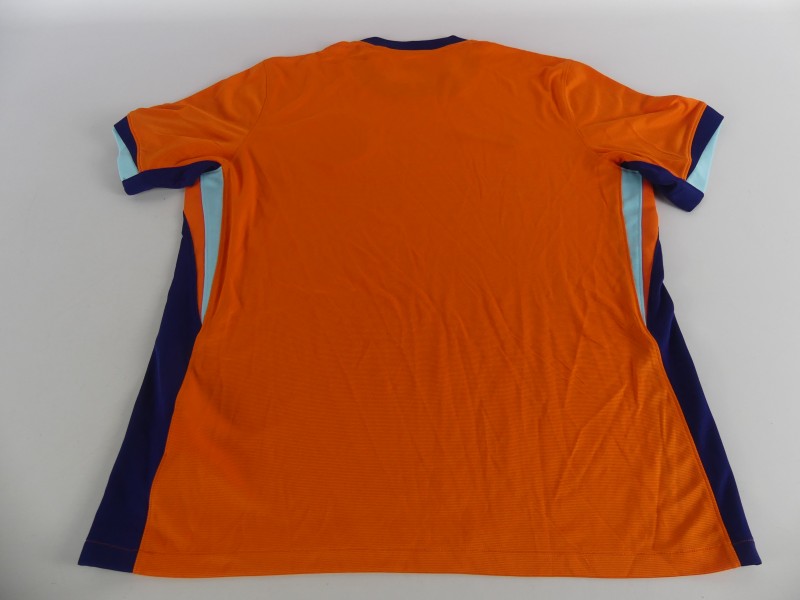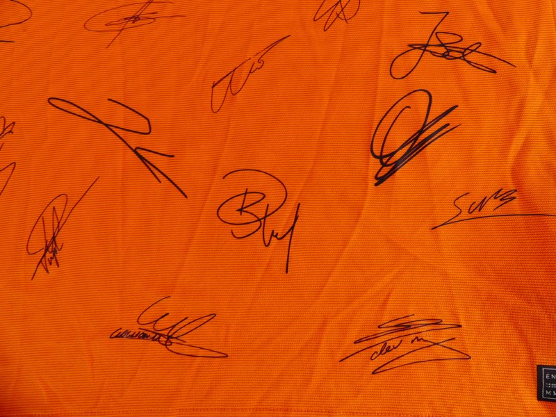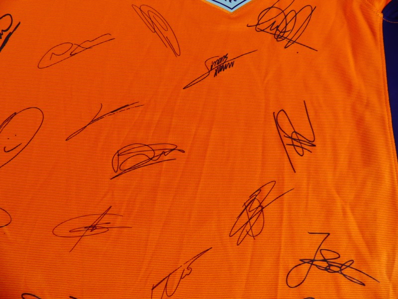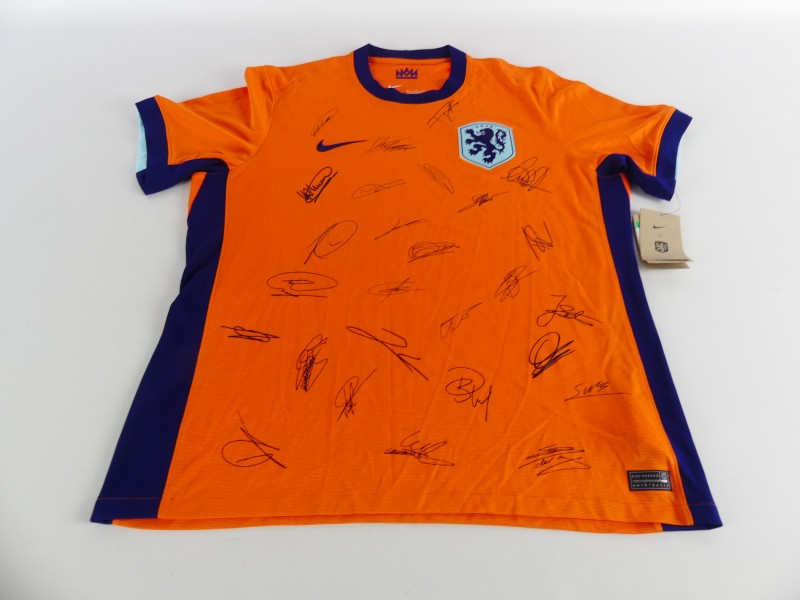 Nederlands voetbalshirt, geproduceerd door Nike als exclusief product voor de KNVB. Het shirt is uitgevoerd in de kenmerkende oranje kleur van het Nederlands elftal en voorzien van geprinte handtekeningen van spelers, wat het een bijzonder verzamelobject maakt.