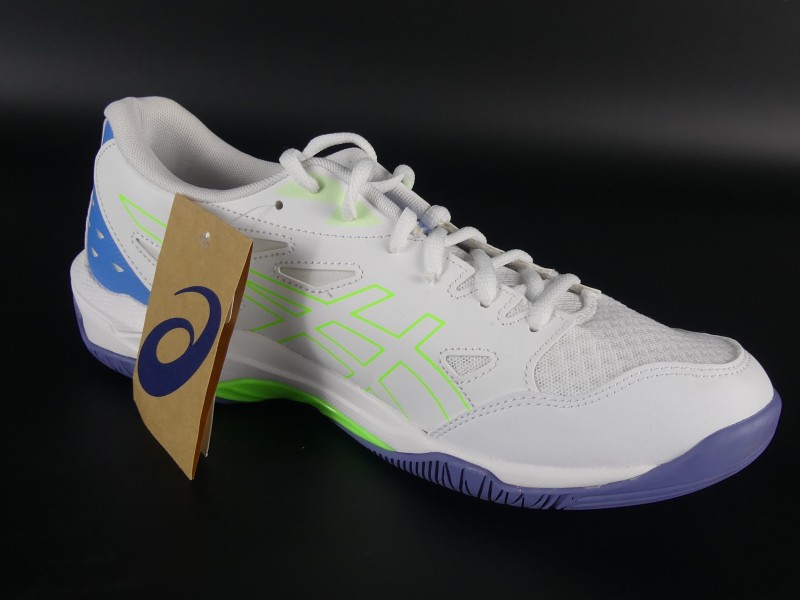 Kleur: Wit bovenwerk, neon groene tussenzool, paarse buitenzool en zwart ASICS-logo.