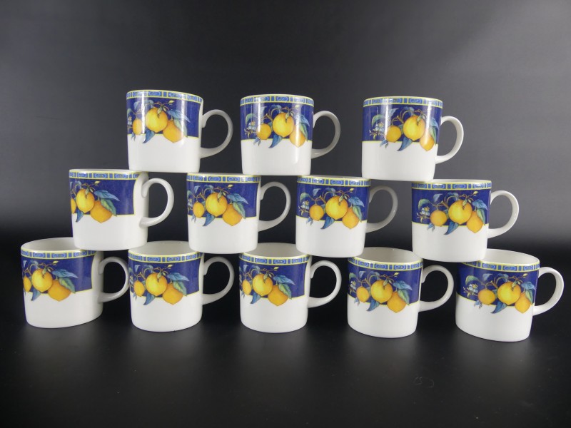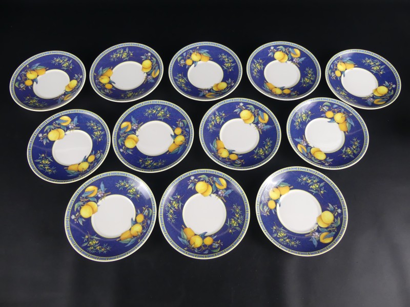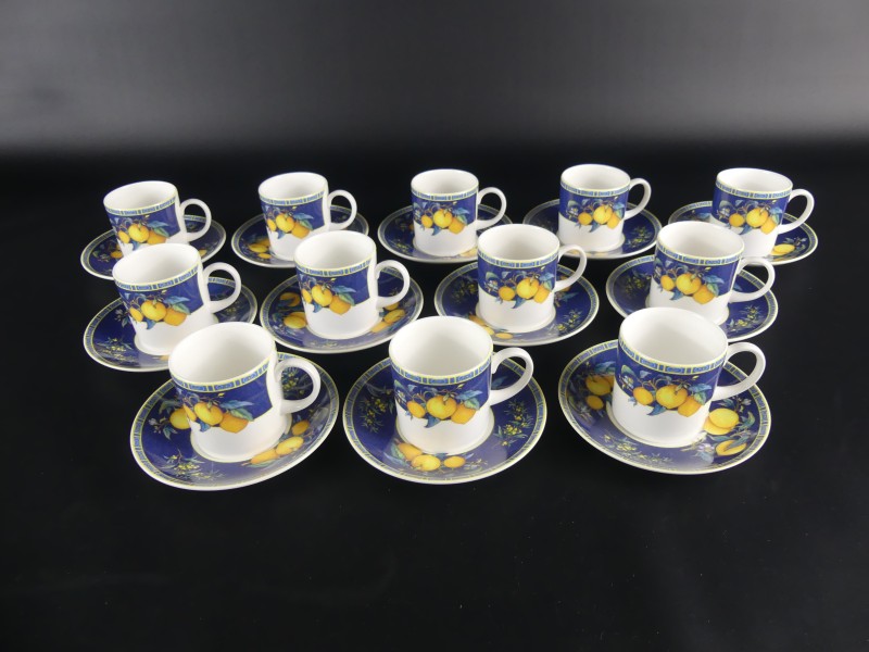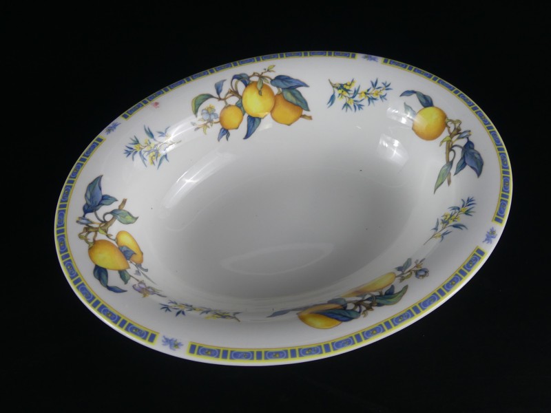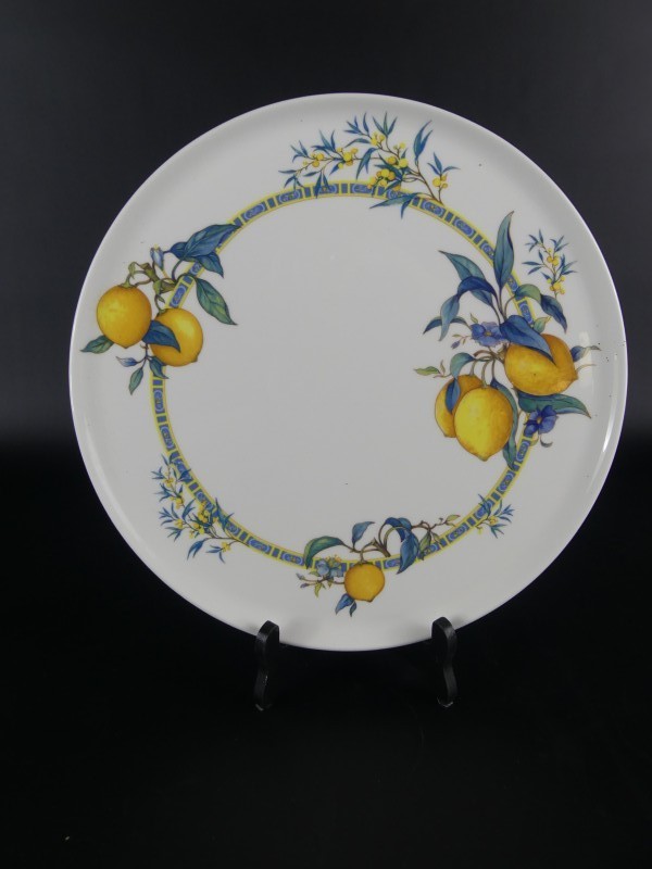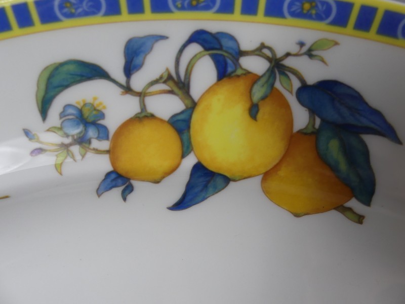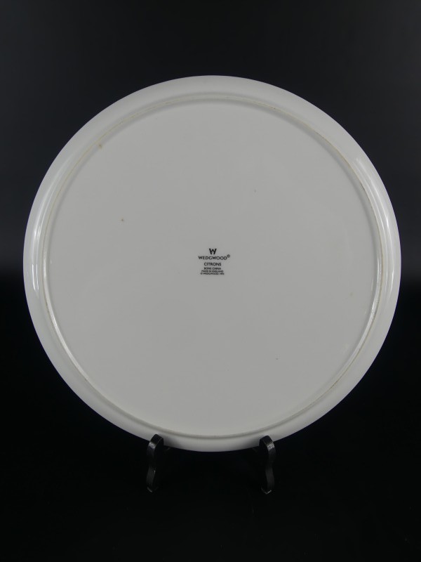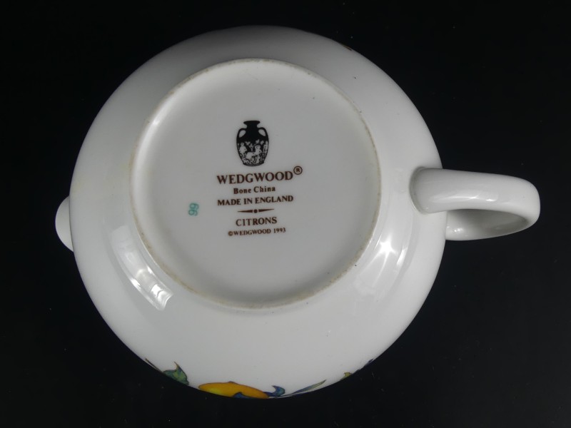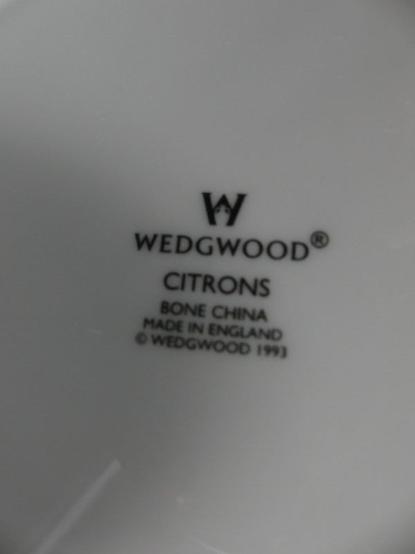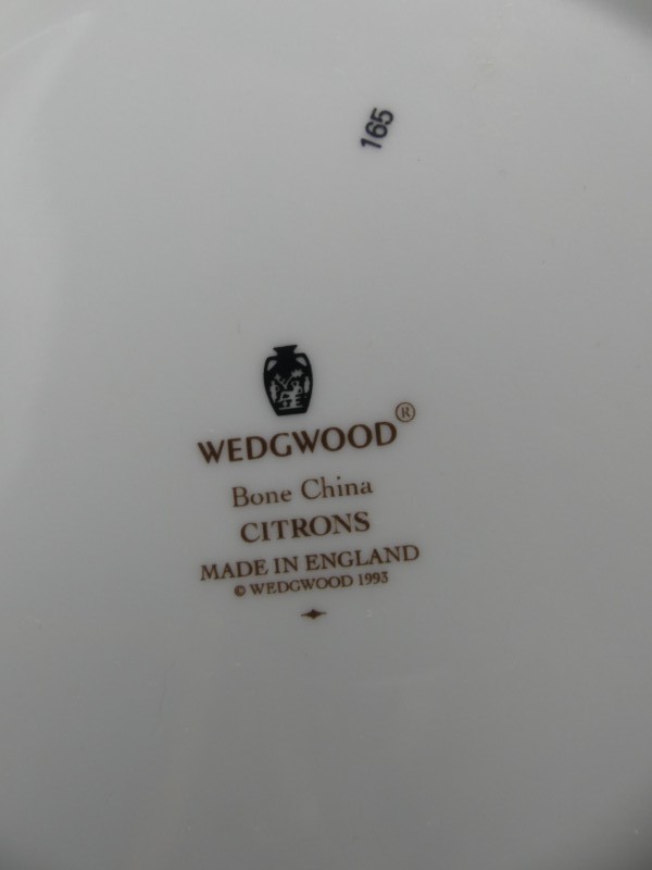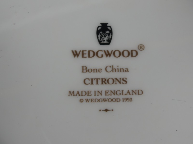 Deze elegante serviesset van Wedgwood is vervaardigd in Engeland (1993) en uitgevoerd in hoogwaardig bone china. Het decor Citrons kenmerkt zich door verfijnde citroenmotieven in geel en blauw. De set bestaat uit verschillende designs binnen hetzelfde patroon en staat bekend om zijn tijdloze en stijlvolle uitstraling.