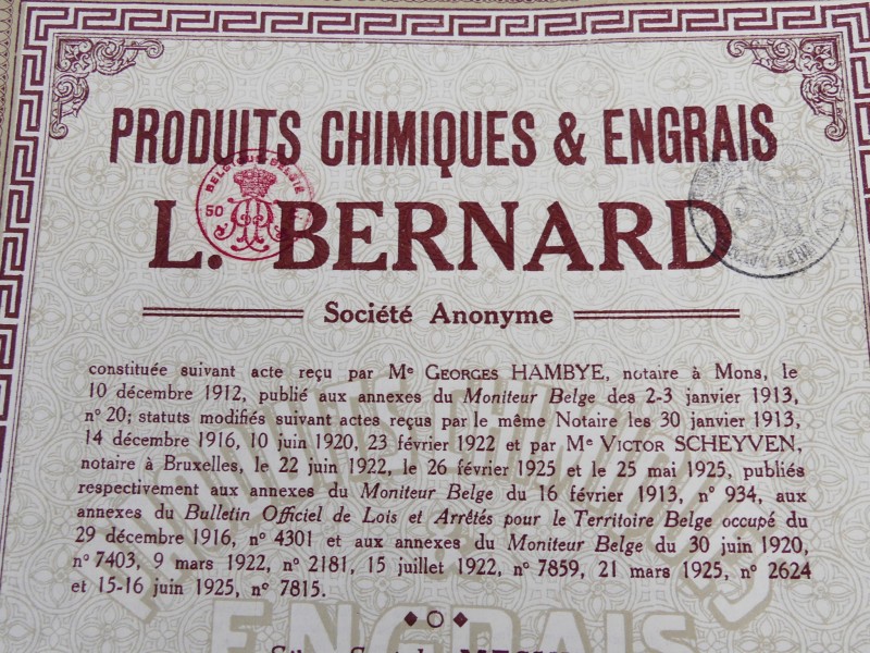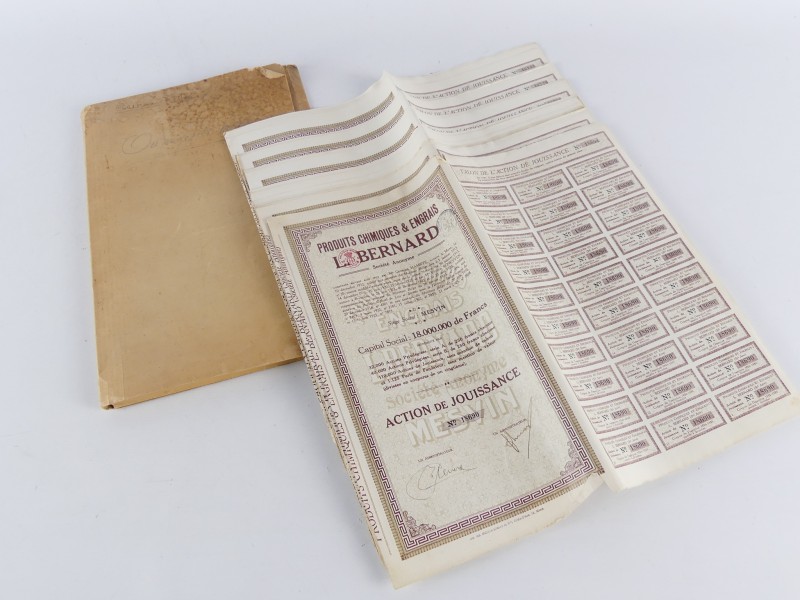Partij vintage aandelen/certificaten van Produits Chimiques & Engrais L. Bernard (België, Mesvin).