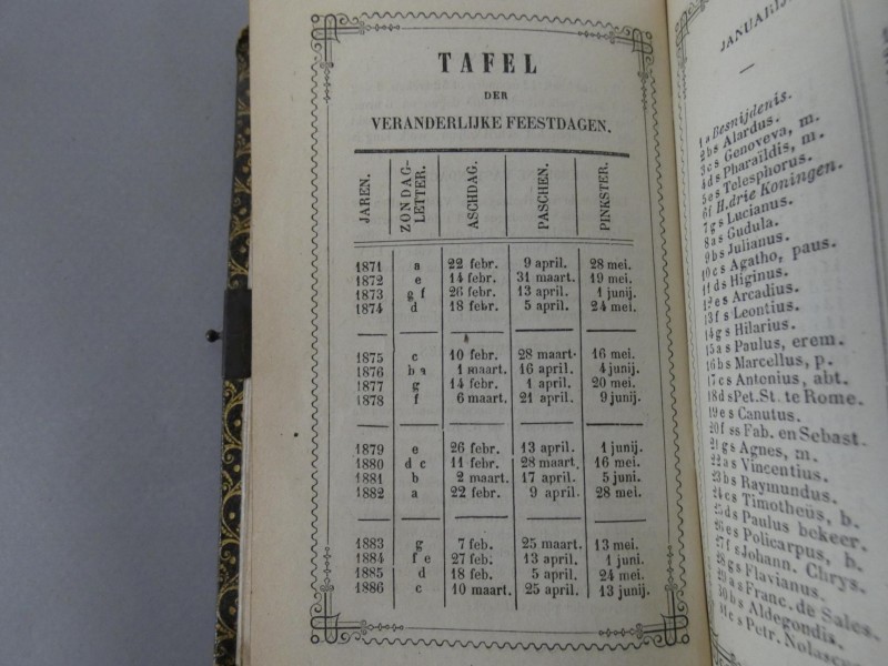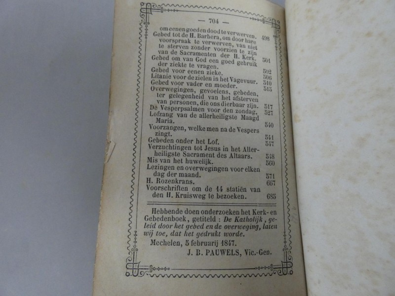 Inhoud en datering: Het boek bevat diverse litanieën, kruiswegstaties en een tabel voor veranderlijke feestdagen. De kerkelijke goedkeuring (Imprimatur) dateert uit 1847 (Mechelen) en 1855 (Amsterdam).