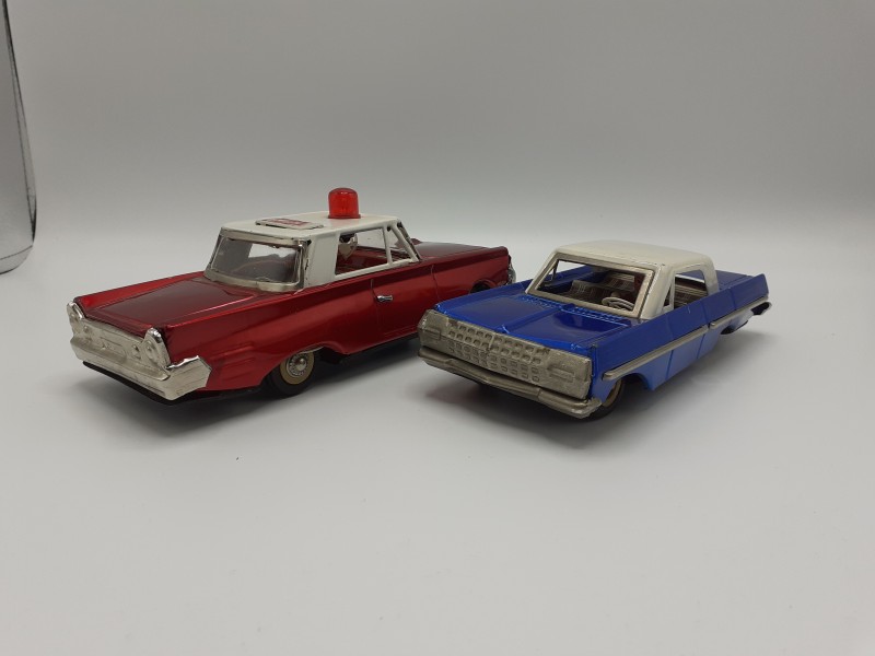 1 rode auto + 1 blauwe auto gemaakt van blik. De blauwe auto rijdt nog perfect, de rode auto kan niet meer rijden.
