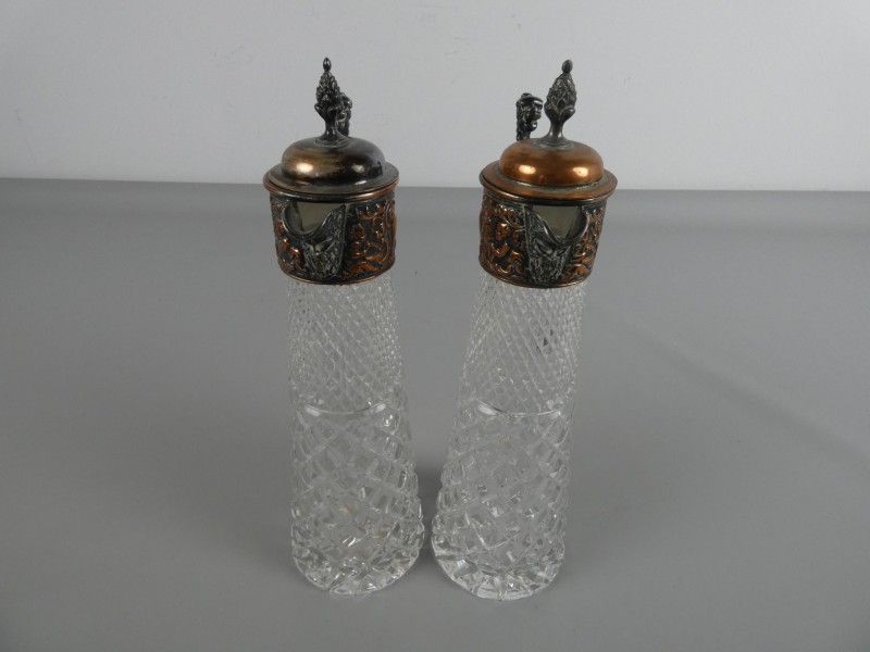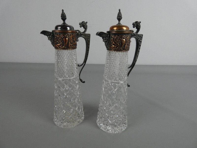 Een prachtig en zeldzaam paar Edwardiaanse (ca. 1900-1910) Claret Karaffen (wijnpitchers) uitgevoerd in zwaar geslepen kristal met een kenmerkend ruitpatroon. Ze zijn voorzien van rijk gedecoreerde, vermoedelijk verzilverde monturen met een fraaie tweekleurige afwerking. Het metalen handvat en de deksel tonen gedetailleerde maskers en decoratieve figuren, wat deze karaffen tot een schitterend voorbeeld van het historische Engelse glaswerk maakt.
