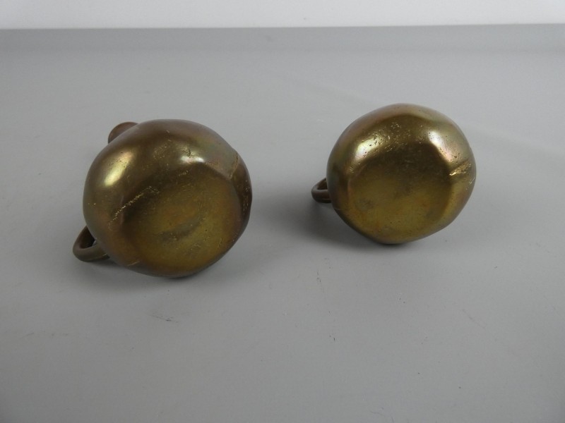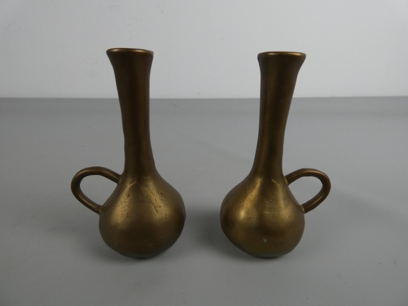 Een prachtig setje van twee kleine, stijlvolle messing vazen met een bolle onderkant en een slanke hals. Elk vaasje is voorzien van een elegant, decoratief handvat.
