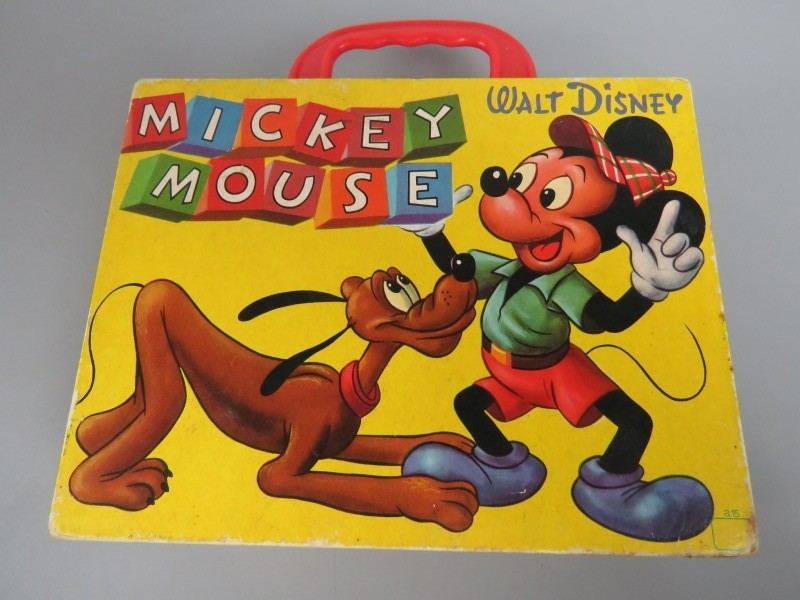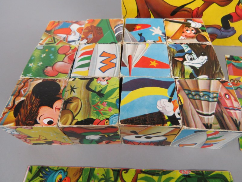 Houten blokkenpuzzel met elke zijkant een stuk van een puzzel. Thema Mickey Mouse. Gemaakt door Walt Disney.