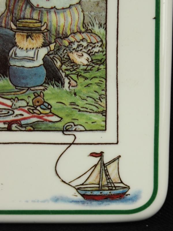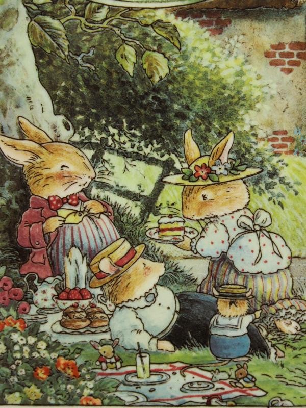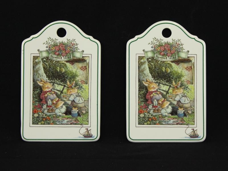 Set van twee decoratieve porseleinen wandbordjes met ophangoog. Voorzien van een gedetailleerde, kleurrijke illustratie van aangeklede konijntjes in een tuinsetting met picknicktafereel. Bovenaan een bloemenkrans met “Foxwood Tales” en rondom een fijne groene rand. Onderaan een klein decoratief bootje. Achterzijde met merkteken.
