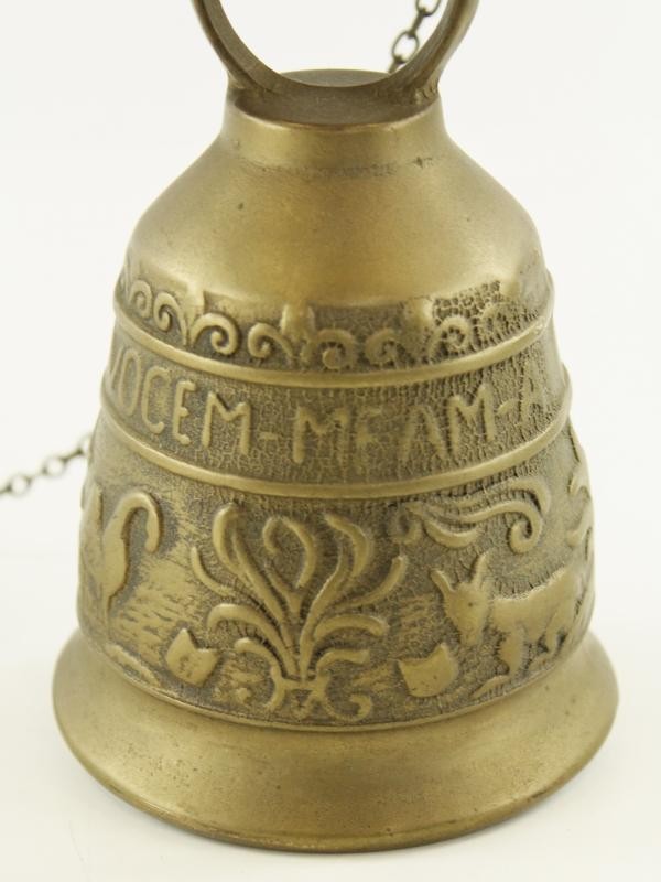 Sierlijke kloosterbel uit messing die aan een muur bevestigd kan worden. De bel is klokvormig en aan de onderkant versierd met verschillende dieren en florale motieven. Bovenaan heeft de bel het opschrift 'Ovime tangit vocem meam'. De muurplaat is aan de voorzijde gedecoreerd met een engel met wijd gespreide vleugels. U kunt de bel doen luiden door te trekken aan de met drakenhoofden versierde handgreep.