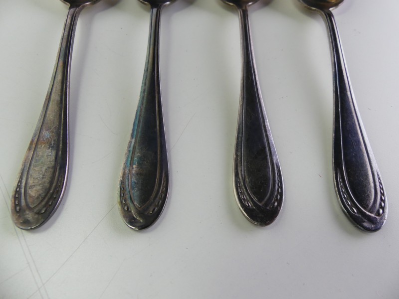 Vintage verzilverde bestekset van Orbrille, in donkerrode koffer, gevoerd met felrode stof binnenin.