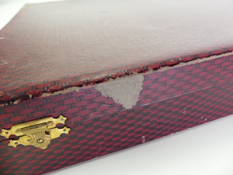 Koffer vertoont slijtagesporen; schuurplekken oxidatiesporen op het metaal, deel van de verdeling voor het bestek binnenin zit los (zie foto's)