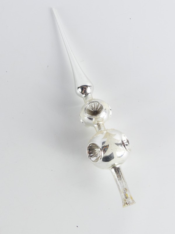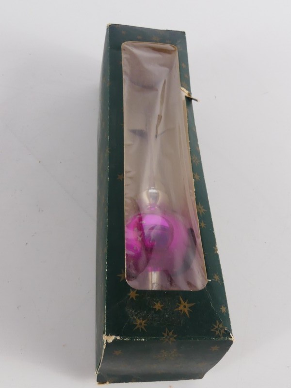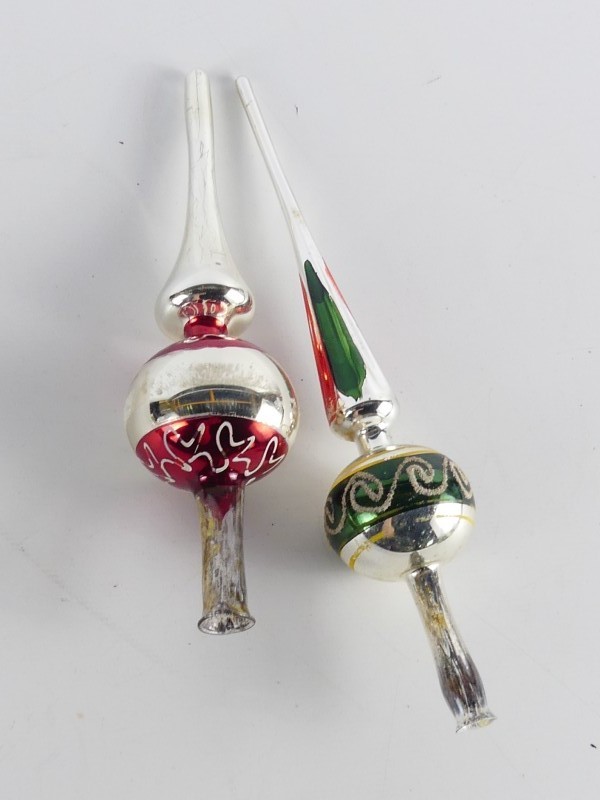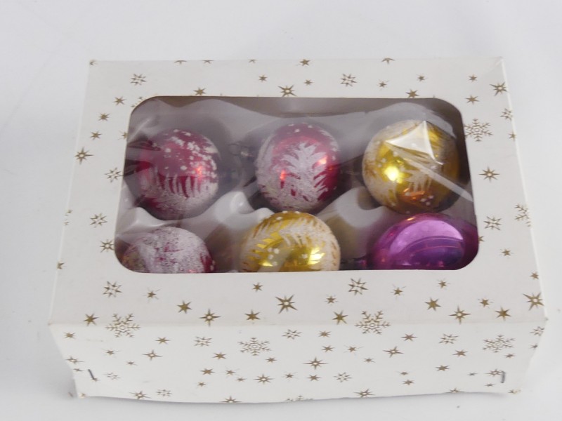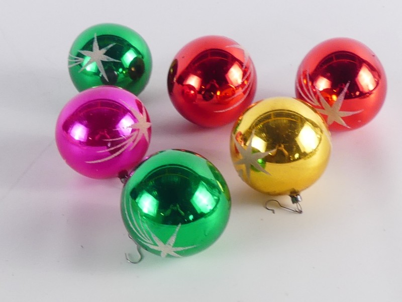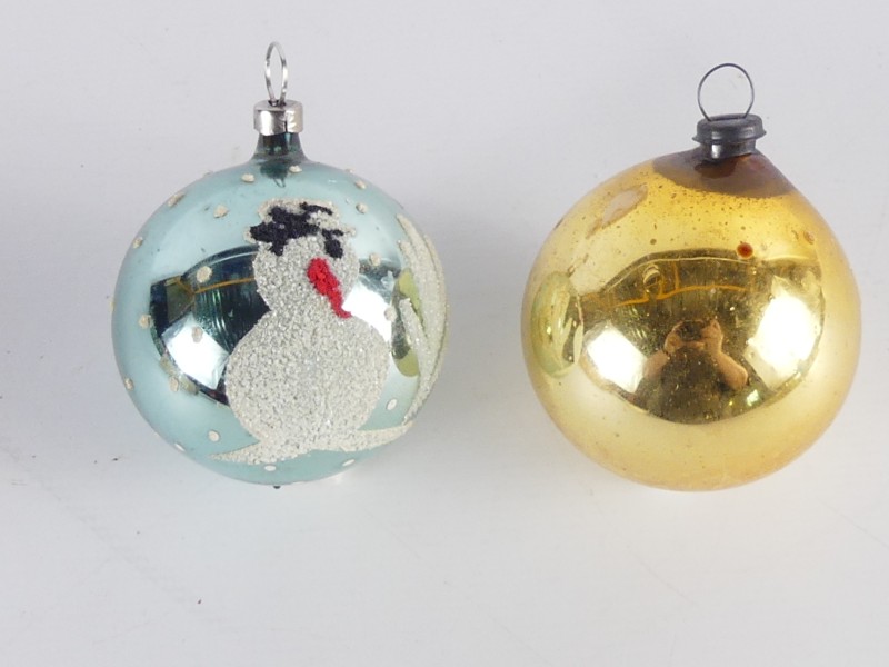 Set van verschillende vintage glazen kersballen. Set bestaat uit 42 kersballen en 5 kersboomtoppers. Alle stukjes in glas. Alle figurtjes hebben verschillende vormen en kleren.