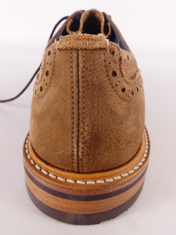 Klassieke Tricker’s veterschoenen van suède, uitgevoerd als brogues (wingtip).