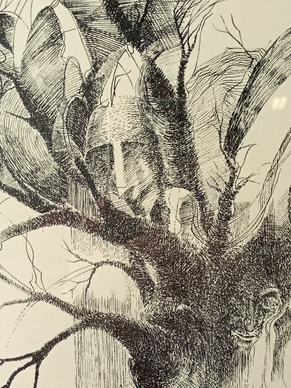 Het werk toont een surrealistische scène met een knoestige boomstronk