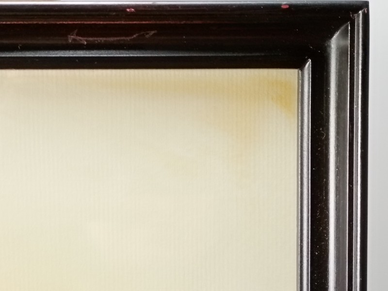 Het kunstwerk is ingelijst in een zwarte lijst met wit passe-partout.