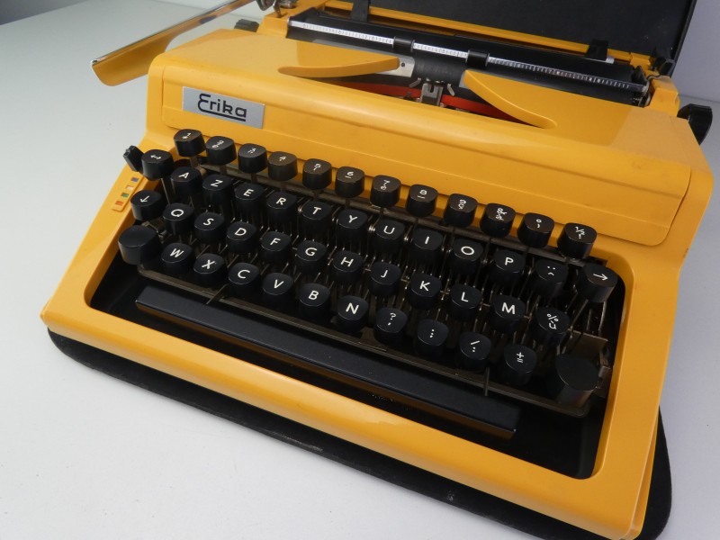 Deze stijlvolle en opvallende gele Robotron Erika Mod.100 draagbare typemachine,