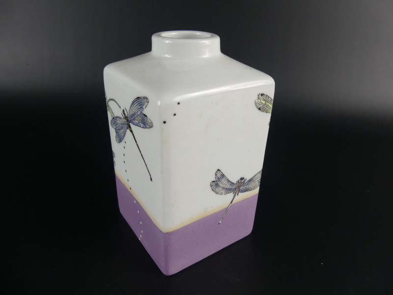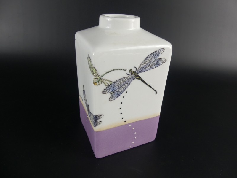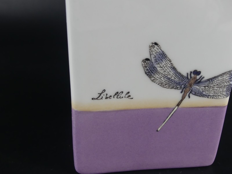 De vaas heeft een prachtig handgeschilderd libellenmotief, een toonbeeld van verfijnd vakmanschap.