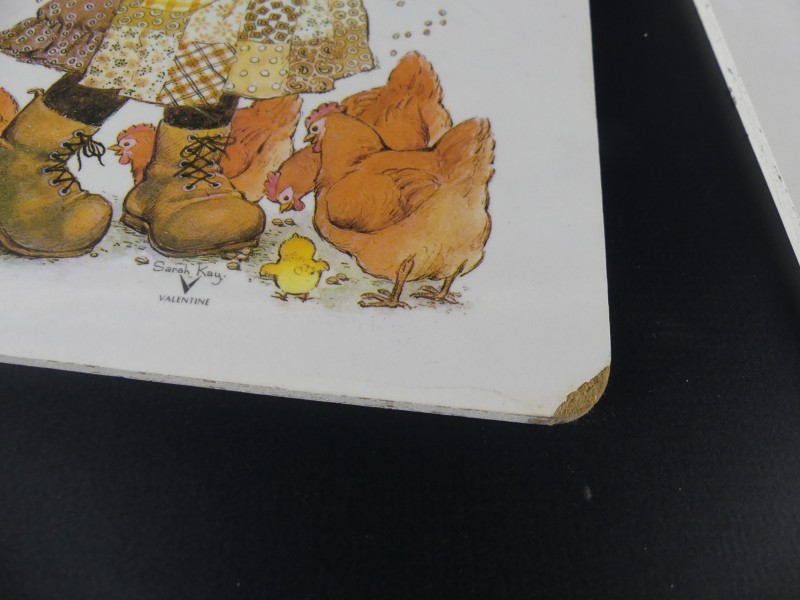 - Drie houten snijplankjes met lieflijke afbeeldingen van meisjes in de kenmerkende vintage stijl van Sarah Kay – met gebruikssporen (kleine chipjes en krassen) Afmetingen 14,5x23,5 cm