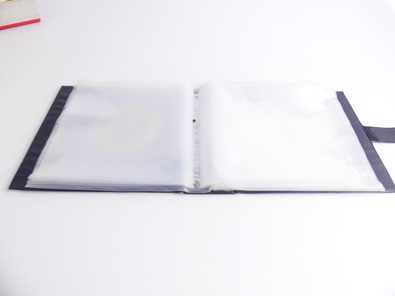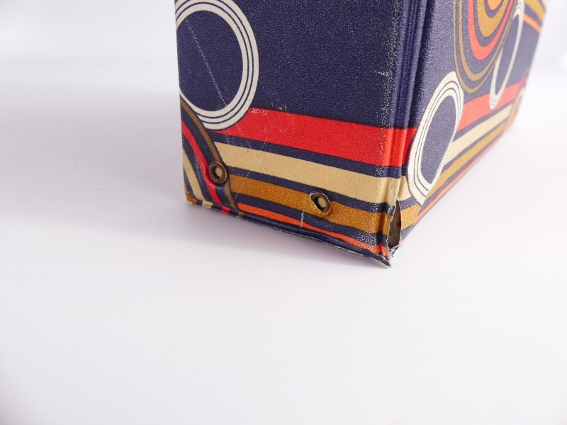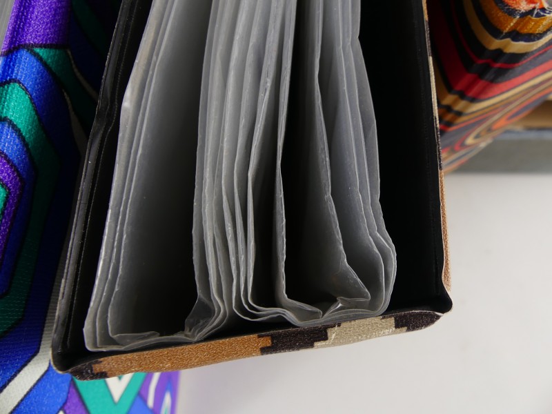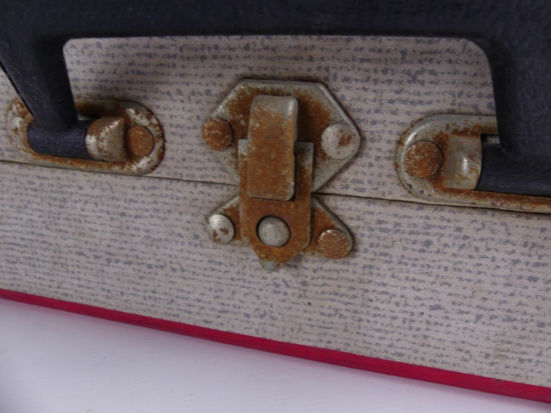 Koffertjes en mapjes in gebruikte staat; slijtplekjes en krasjes, oxidatiesporen, gekreukte hoesjes, op 1 mapje plakt een sticker, barstje in plastic.