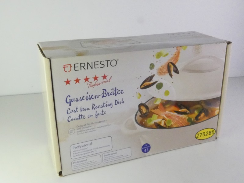 Een gietijzeren braadslede/braadpot van het merk ERNESTO Professional.