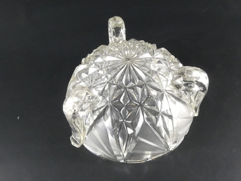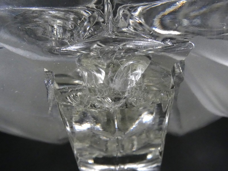 Vintage glazen fruitschaal in transparant en mat glas rustend op 3 pootjes.