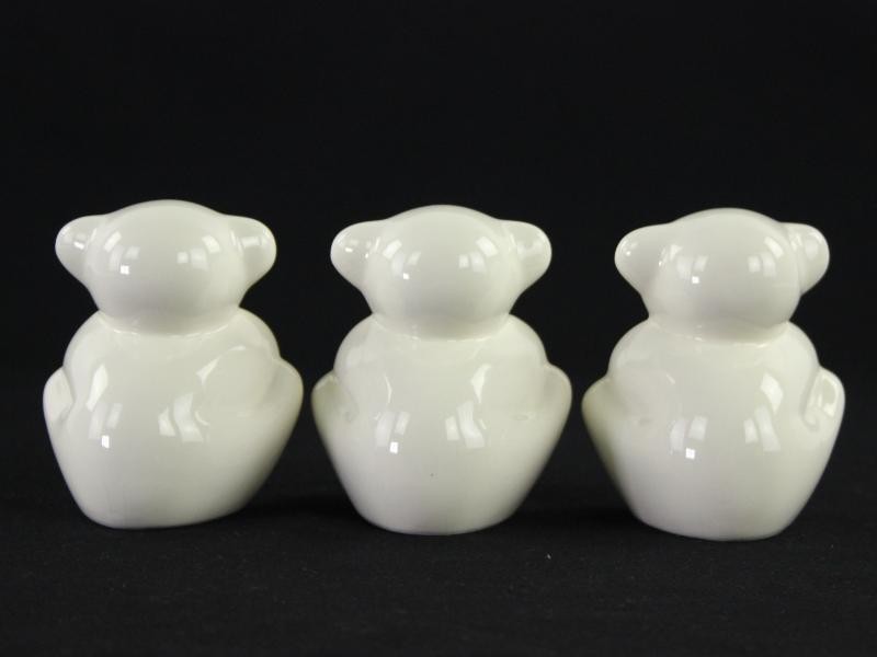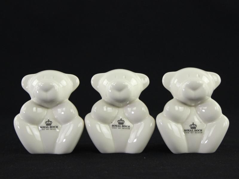 Trio van kleine witte beertjes uit keramiek. De beertjes komen uit de 'Fast Affection Bear'-collectie, ontworpen door Rik Delrue (°1963) voor Royal Boch. De beertjes zijn voorzien van stickers met het opschrift 'Royal Boch'.