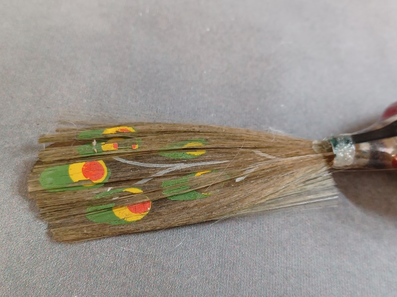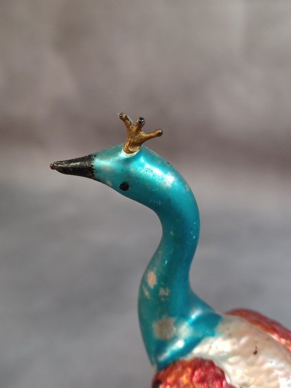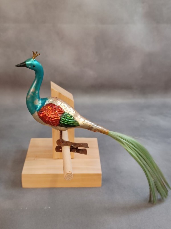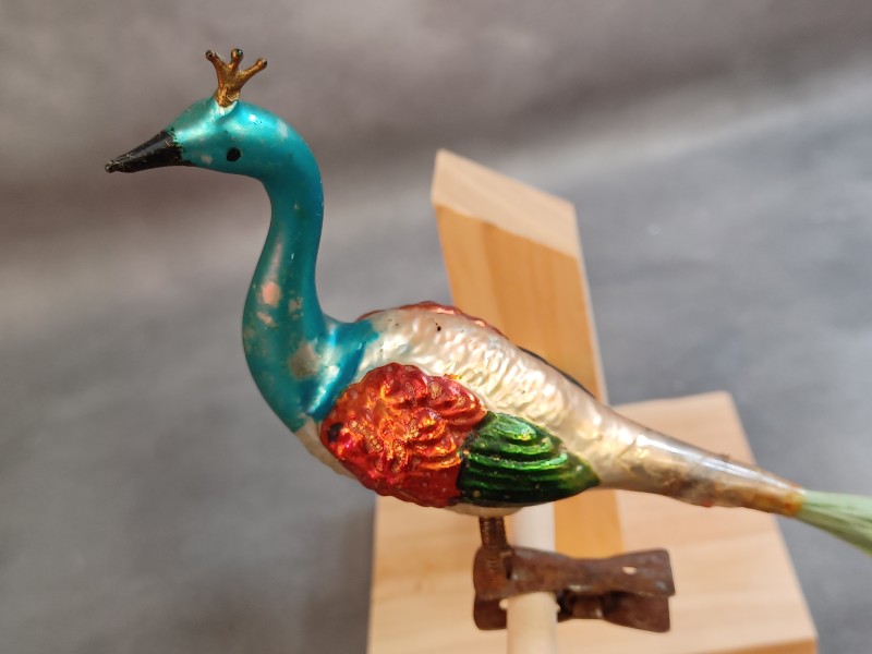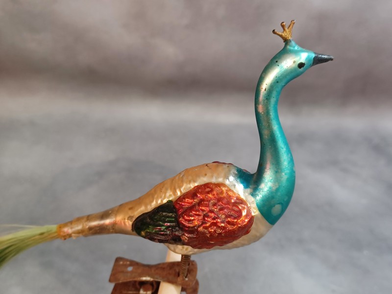 - Alle pauwen hebben een kroontje en zijn kleurrijk. Twee pauwen hebben nog hun originele nijper om ze vast te knijpen op de takken van de kerstboom. Bij de derde is de nijper verdwenen.