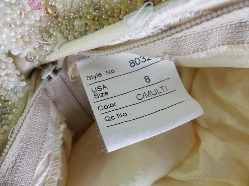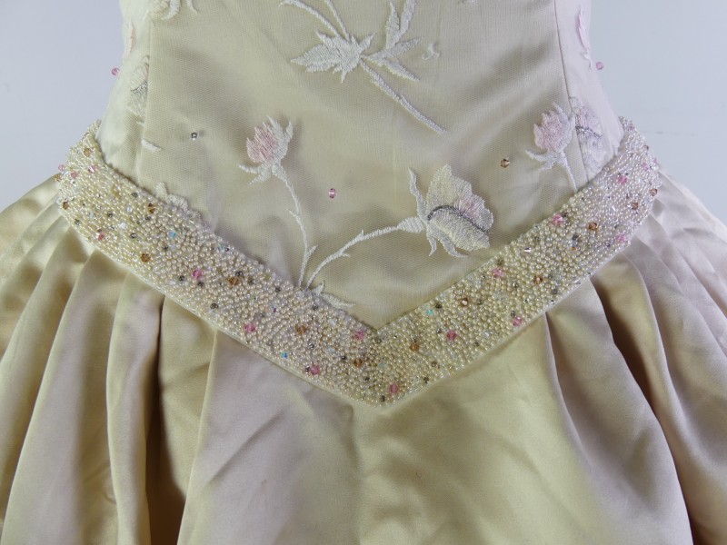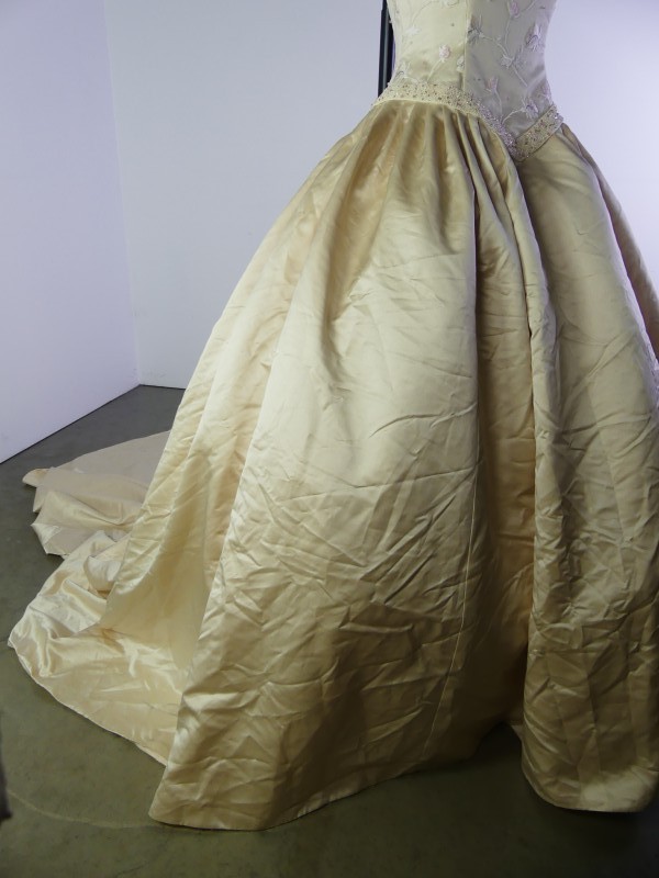 De trouwjurk van het bekende Amerikaanse merk Justin Alexander. De jurk heeft een klassiek getailleerrd Ball Gown silhouet. De jurk heeft een corsetconstructie met een off-schoulder bovenstuk. De volumineuze rok zit op een onderrok van tule. De jurk heeft een lange sleep. De rok is gemaakt van kunstmatige satin in champagnekleur met een multititoon effect. Het lijfje van de jurk is gedecoreerd met borduurwerk op tule in de vorm van een bloemenmotief in zachte pastelkleuren. OOk de onderkant van het corset, de decolletelijn en de mouwen zijn versierd met borduurwerk van klaren en gekleurde parels, afgestemd op de kleuren van de bloemen op het lijfje.