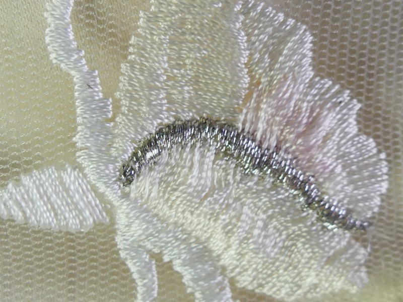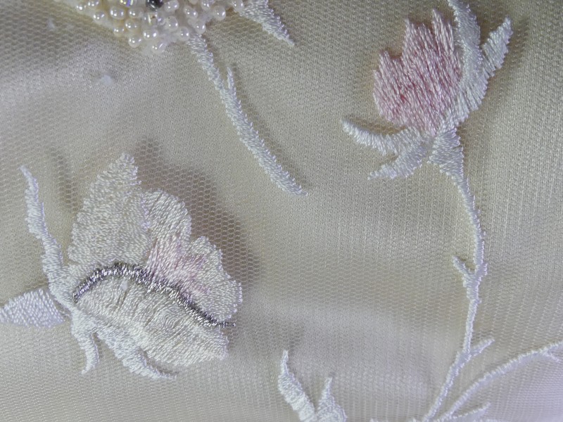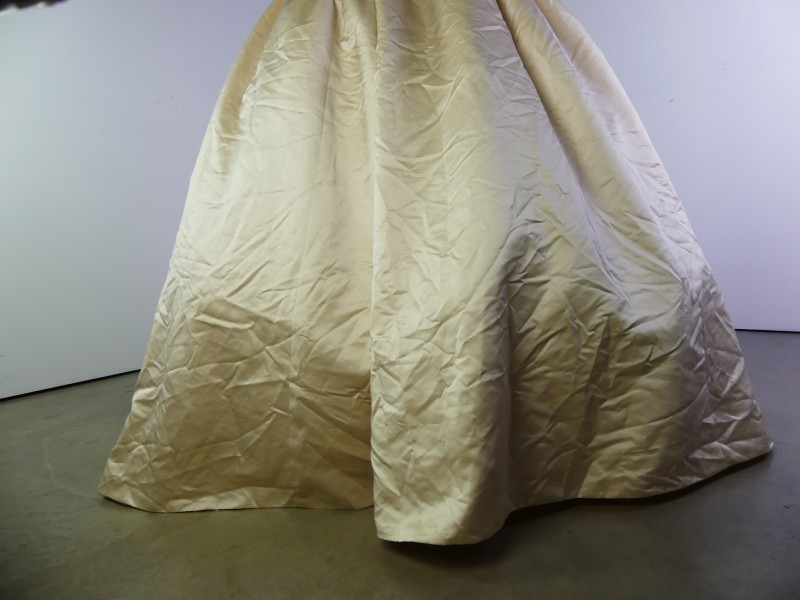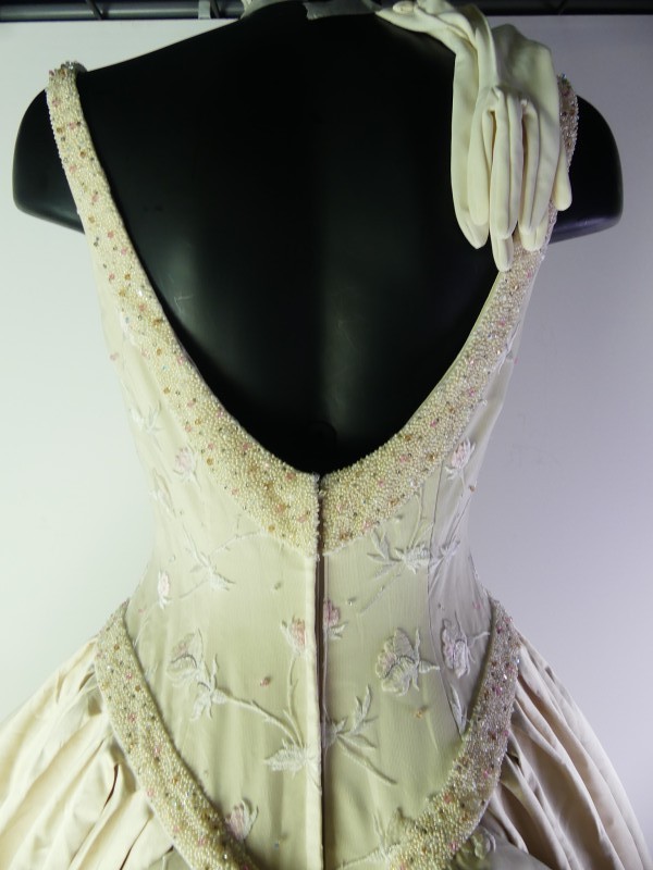 De jurk is aangevuld met een kanten halssieraal dat het bloemborduurwerk van het lijfje herhaalt, evenals witte korte handschoenen van satijn.