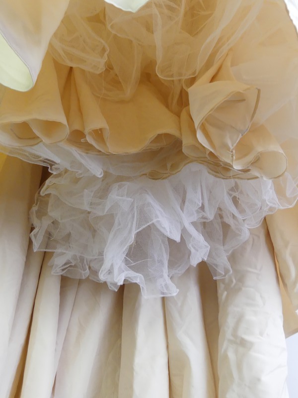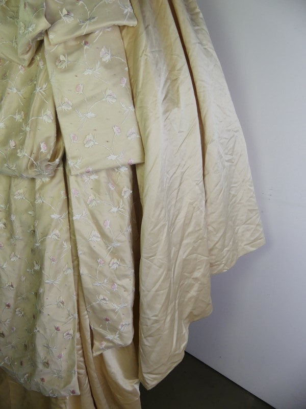 Aan de achterkant heeft de jurk een open rug en een 3-laagsz tournure van de hoofdstof en tule met bloemrijke borduursels.