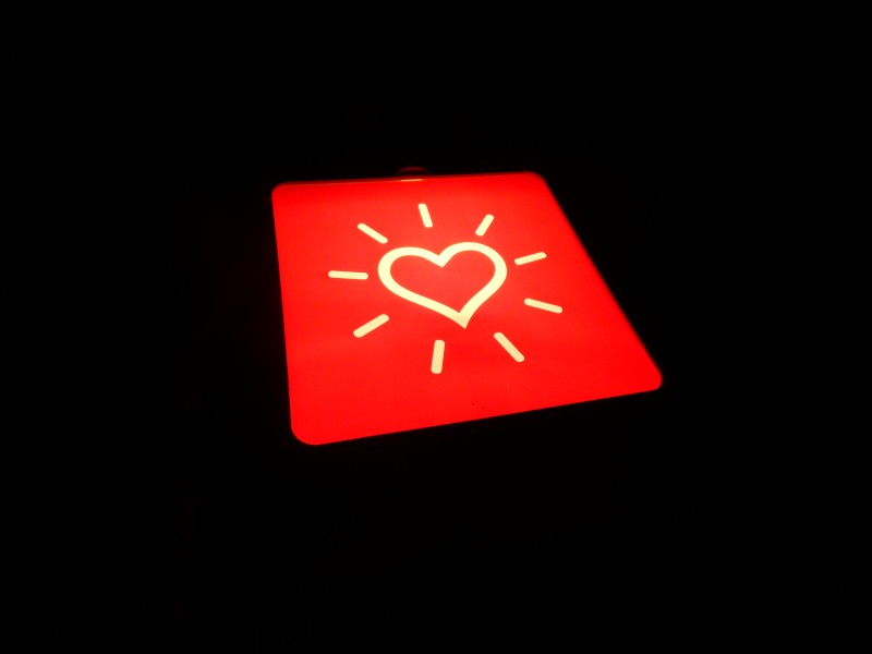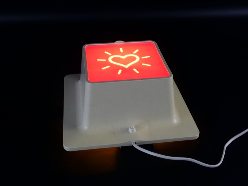 De lamp heeft gewoonlijk 10 verschillende pictogrammen die je gemakkelijk kan verwisselen, dit examplaar heeft alleen nog maar het roze hartjes pictogram.