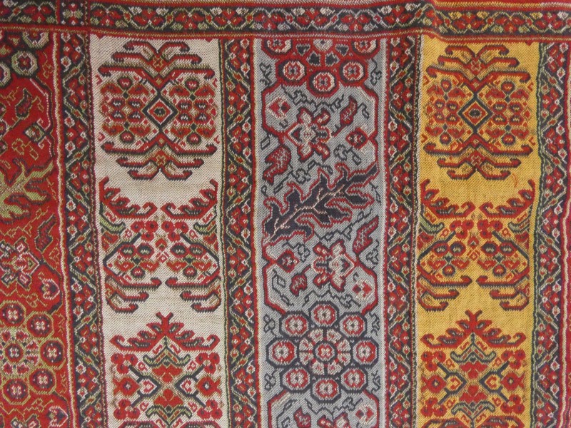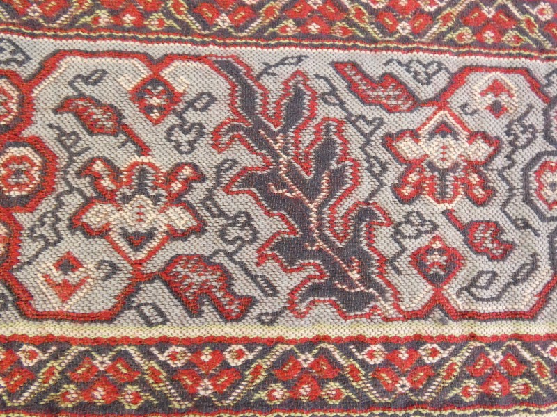 Decoratief vintage tapijt met rijke oosterse motieven in warme rood-, geel-, blauw- en wittinten. Fijn gedetailleerd patroon met florale en geometrische elementen, afgewerkt met franjes. In goede staat, met lichte gebruikssporen en enige slijtage aan de franjes.