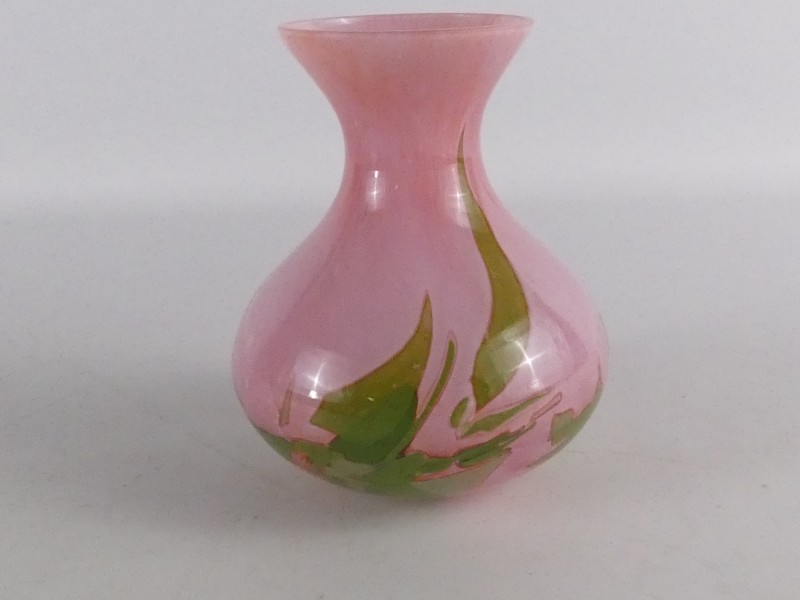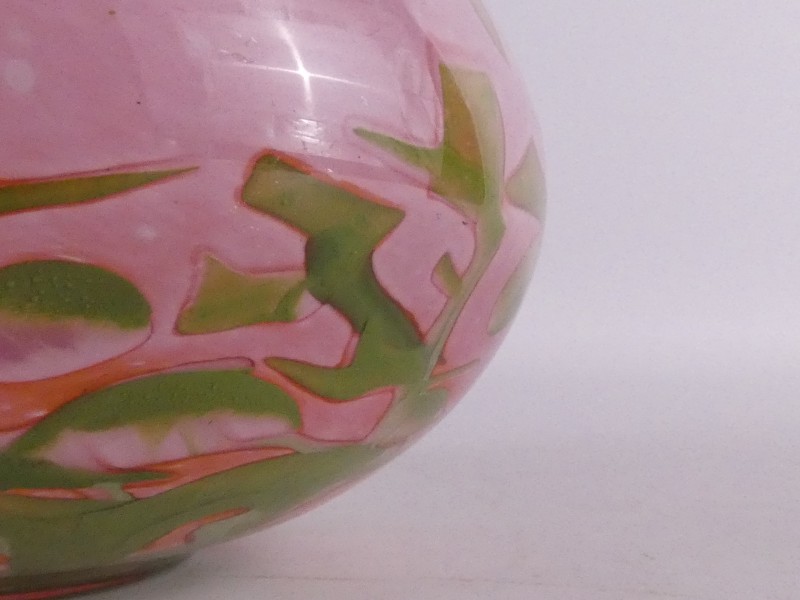 Prachtige vaas van het Franse glasatelier La Rochère, uitgevoerd in zacht roze opaalglas met levendige groene insluitingen. De elegante bolle vorm met uitlopende hals geeft het stuk een verfijnde, artistieke uitstraling. Onderaan gemerkt met La Rochère.