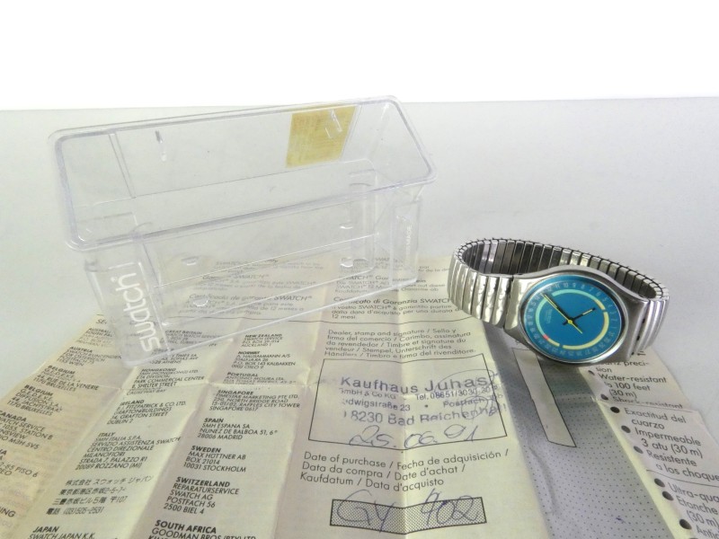 Het is een gedragen vintage staat. Het glas heeft lichte gebruiksporen (kenmerkend voor Swatch uit deze tijd, maar polijstbaar).