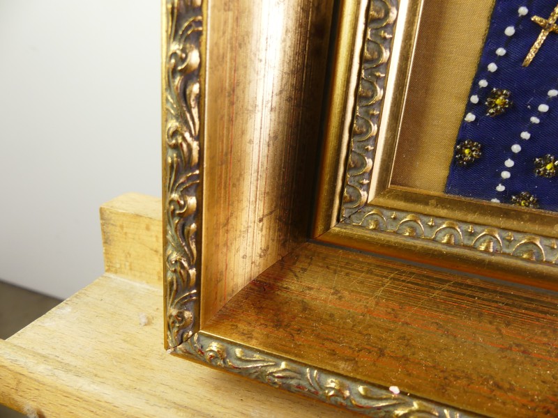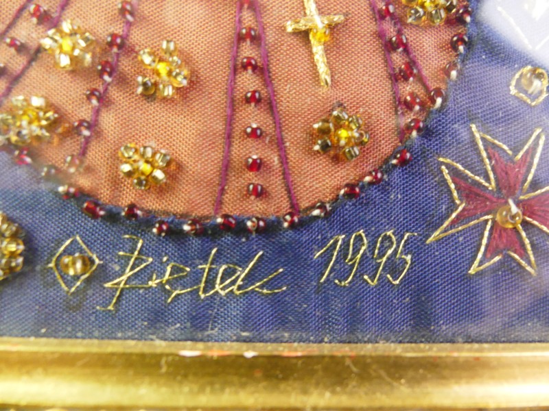 Fijn handwerk, uitgevoerd met kralen en gouddraad. Gesigneerd (handtekening onleesbaar), 1995. De iconografie is rijk gedetailleerd, met engelen en symbolische motieven, geplaatst in een vergulde, sierlijke lijst. Op de achterzijde bevindt zich een tekst over de geschiedenis van de icoon van Jasna Góra in Polen.