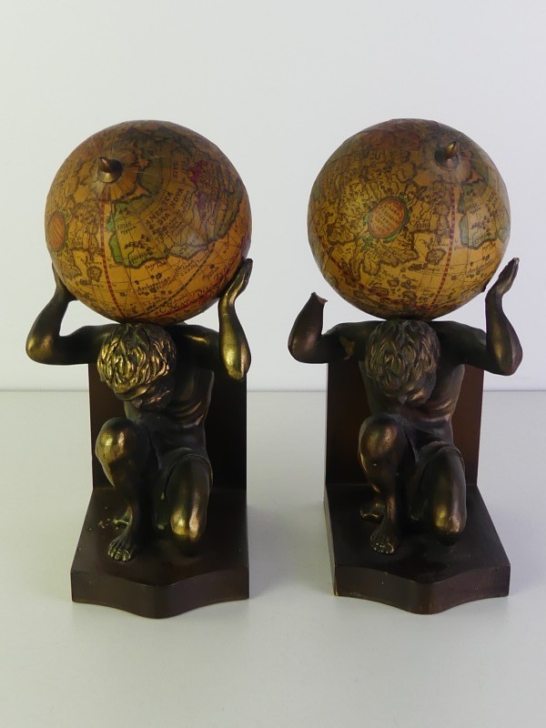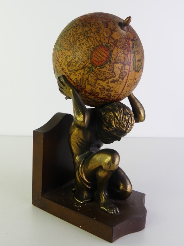 Prachtige set boekensteunen met de voorstelling van de Griekse god Atlas, afgebeeld terwijl hij de hemel op zijn schouders draagt. Dit mythische symbool van kracht en standvastigheid maakt de boekensteunen niet alleen functioneel, maar ook een bijzondere blikvanger in elk interieur.