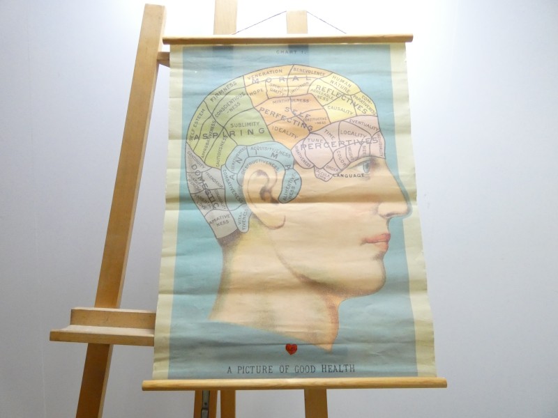 Een anatomische voorstelling van een menselijk hoofd, met een schematische verdeling van de zones en hun functies of gezondheidsaspecten. Deze kaart straalt een educatieve en historische charme uit.