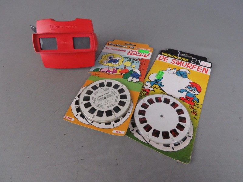 Vintage 3D viewmaster met fotofiches van de smurfen.
