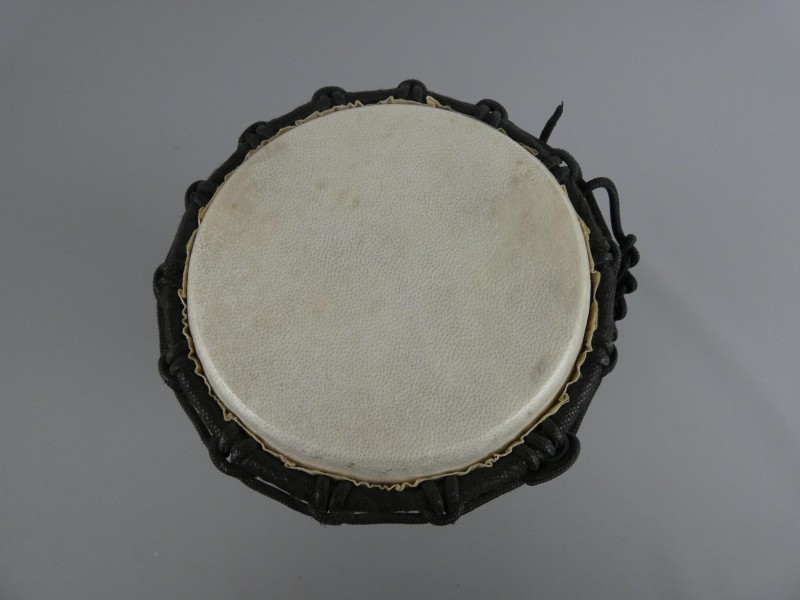 Vel: Voorzien van een klassiek, lichtkleurig slagvel, op spanning gehouden door een traditioneel zwart touwspansysteem.