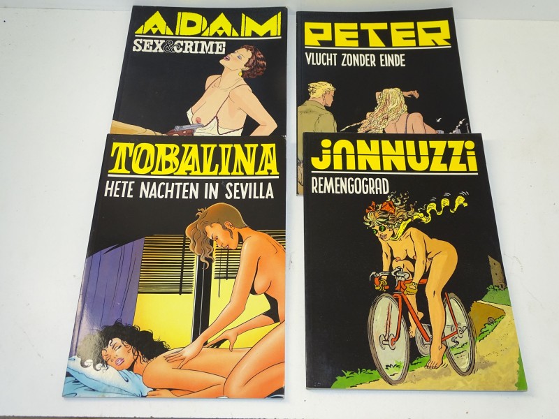 Van Uitgeverij Sombrero hebben we hier 4 erotische strips die telkens getekend zijn door verschillende tekenaars. Het gaat om deze stripverhalen: 'Sex & Crime' door Adam, 'Remengograd' door Januzzi, 'Vlucht Zonder Einde' door Peter en tot slot 'Hete Nachten in Sevilla' getekend door Tobalina.