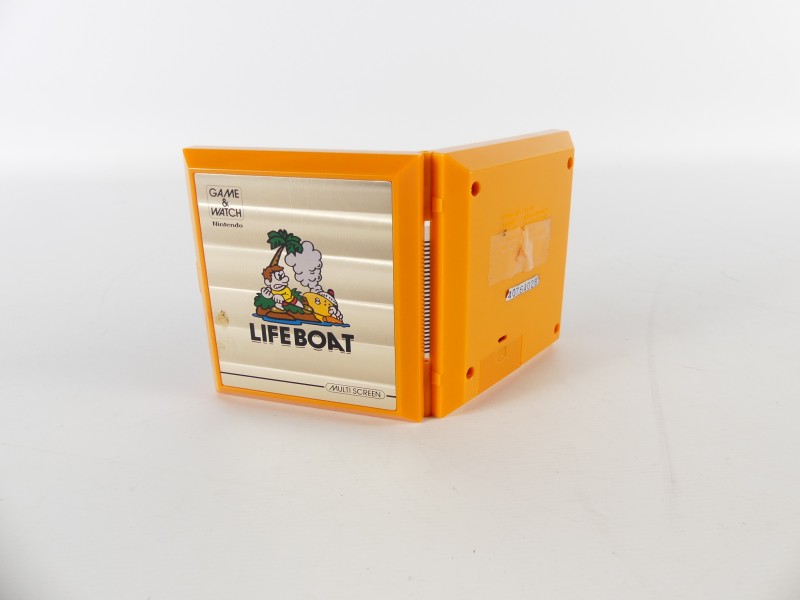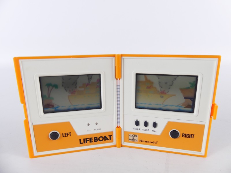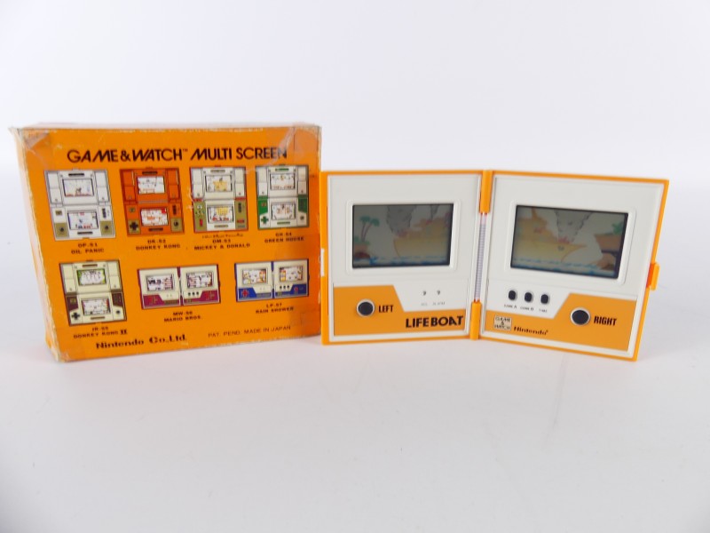 Originele Nintendo Game & Watch Multi Screen-handheld uit 1983, model Lifeboat (TC-58). Deze klassieke elektronische handheld toont op twee LCD-schermen een reddingsspel waarin spelers drenkelingen naar veiligheid moeten brengen.