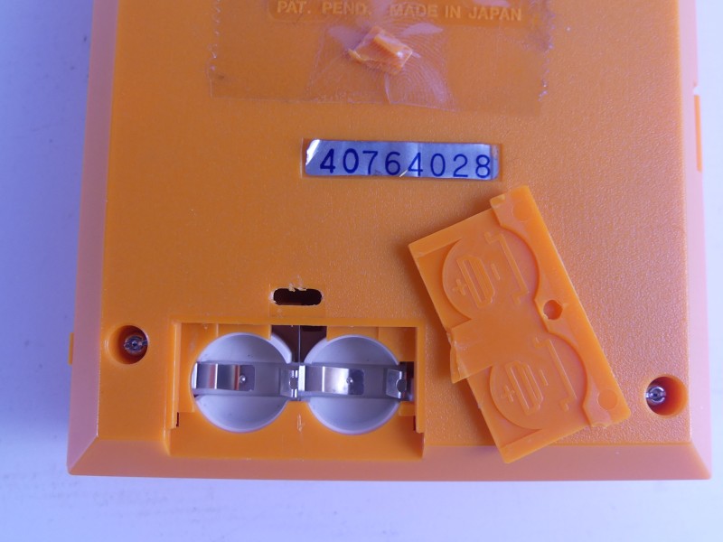 Het toestel werkt op twee LR44-batterijen en is voorzien van het originele serienummer (40764028). Geproduceerd door Nintendo Co. Ltd., Made in Japan.