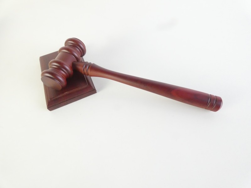Houten voorzittershamer en klankbord, vermoedelijk gemaakt uit teakhout, in bordeaux kleur.