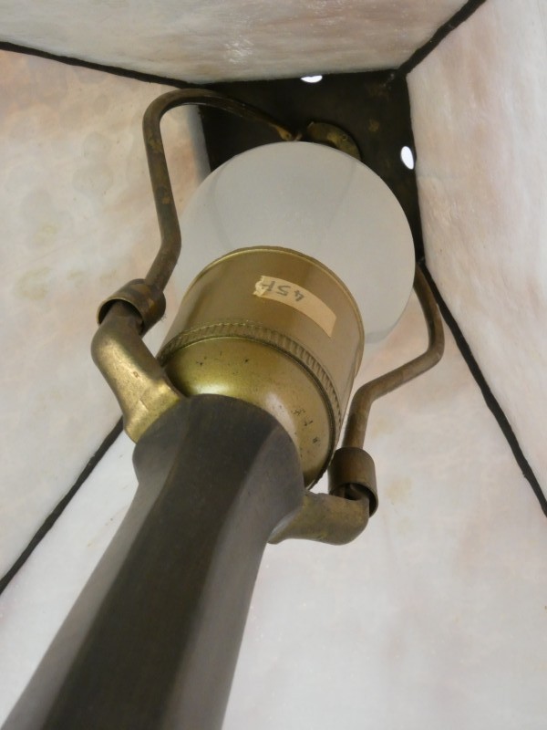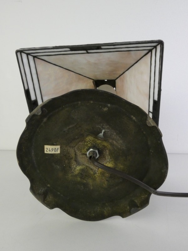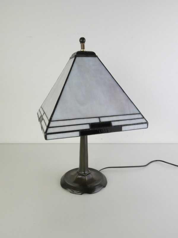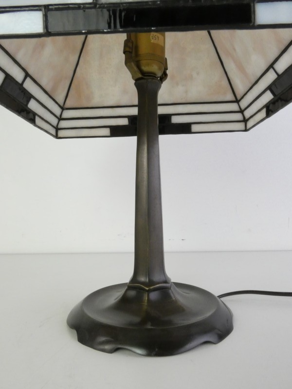 Vintage tafellamp met wit en zwart glas in glas-in-lood mozaïek.